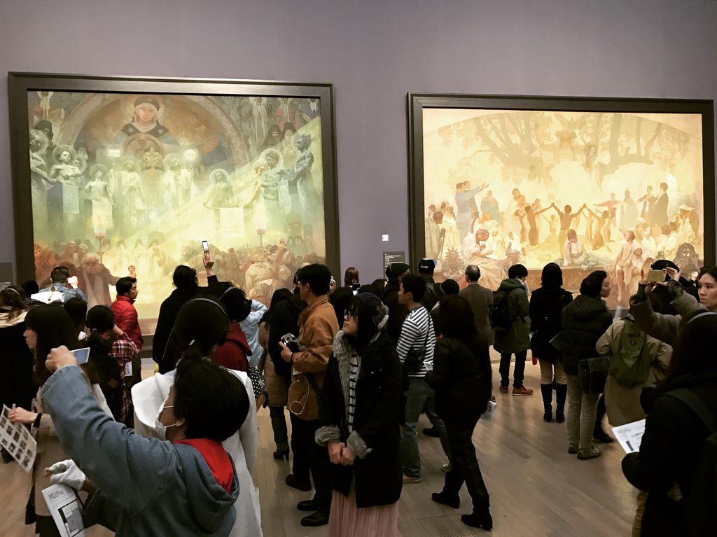 ミュシャのスラヴ叙事詩は、6メートル×8メートルというサイズのカンヴァスに描かれた20点の絵画から構成される作品で、国立新美術館が、それだけ高さがあった?!というのもまず驚きましたが、入口に入り、実物とご対面すると、海外の美術館にいる気分に一瞬にしてなりました。圧巻!!!