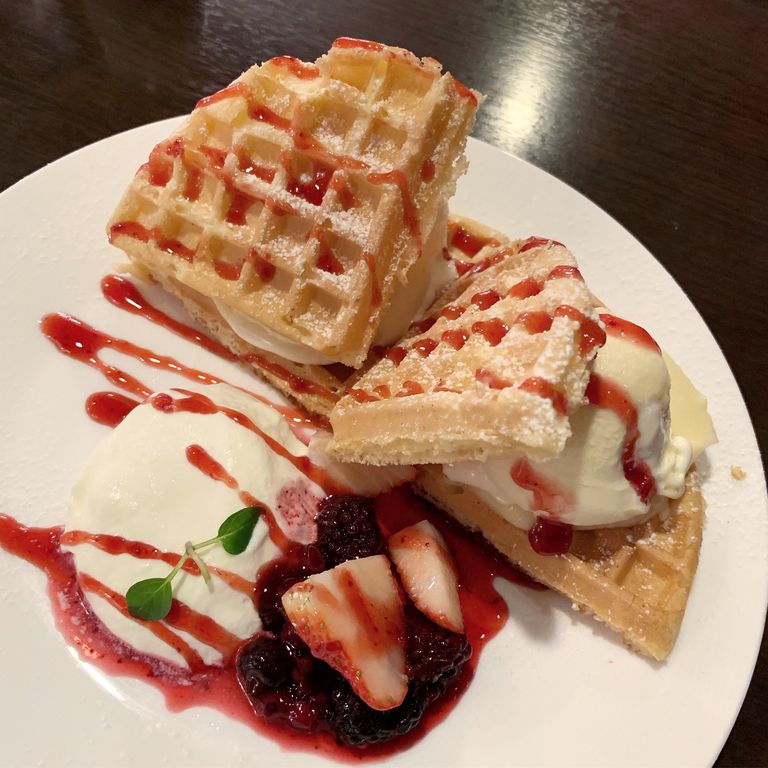 ここのワッフル、すごくおいしいんです。ワッフルがやわらか目で、アイスクリームとカスタードクリーム、生クリームといい感じでコラボしてくれます。カスタードが入っているのって、あまりないから、コッテリ甘いものを食べたいときは最高です。