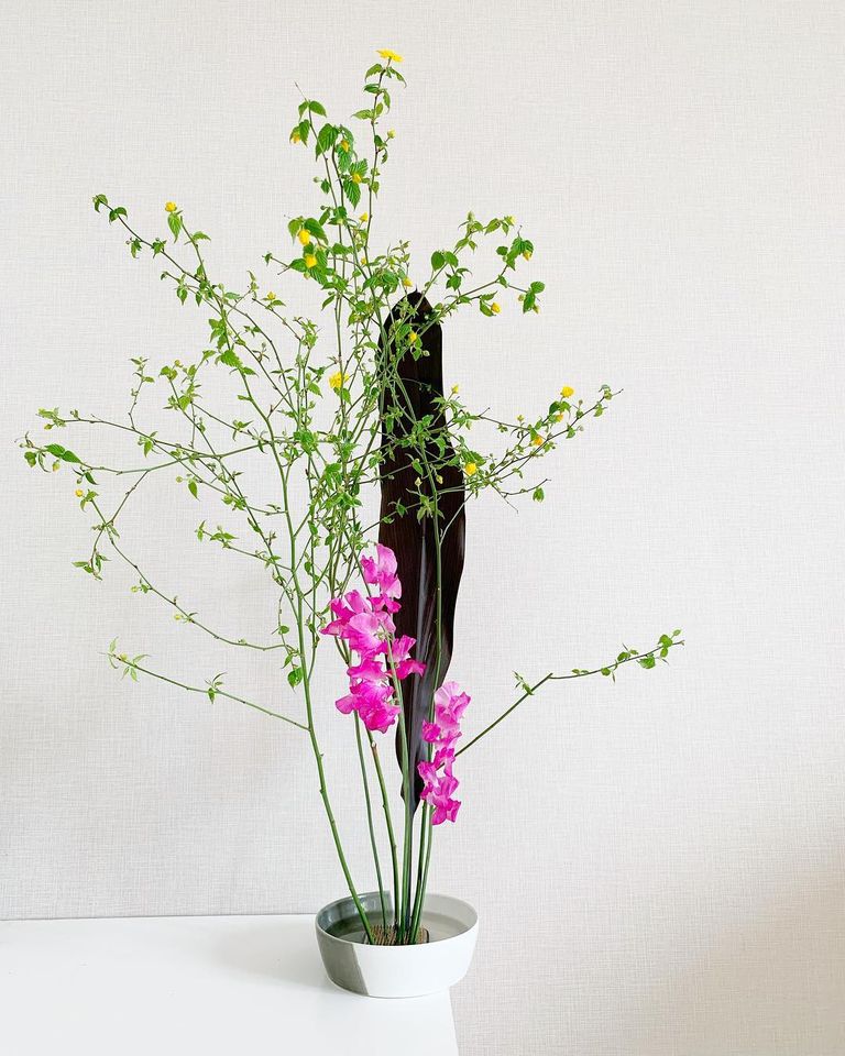 この「山吹」という枝が、横に広がりすぎていまして、それを師匠はいとも簡単に1本目となる「真」の部分に、「真」らしいかたちにワイヤーのように絡ませていました。しかし、私がそれをやろうとすると30分くらいの格闘となりました。なのでこれは、奇跡の1枚です。(笑) お花がすべて正面に向いているのです。